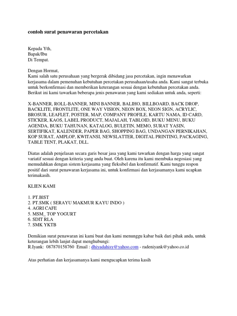 Demikian surat penawaran ini kami buat, atas pertimbangan dan kerja samanya kami sampaikan terima kasih. Karena surat penawaran kerjasama memiliki format dalam penulisan nya dan biasanya ditujukan untuk sebuah berikut ini admin berikan contoh surat penawaran kerjasama dalam bahasa inggris, check this out. Excellent air kepada bapak/ibu kepala sekolah sma harapan bangsa dengan maksud untuk menawarkan kerjasama dalam memberikan pelayanan jasa perancangan aplikasi website sekolah terkait. Contoh surat penawaran untuk berbagai keperluan. Disamping memiliki pengaruh yang baik untuk membuat jenis usaha kita dapat laris dan laku dipasaran.