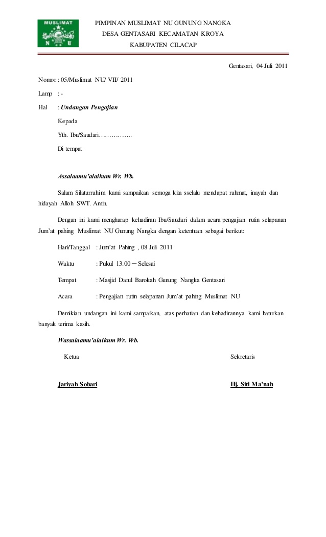 Contoh surat undangan peresmian masjid. Setelah dibahas mengenai beberapa contoh surat undangan resmi, dimulai dari surat undangan perusahaan, surat undangan pembagian raport sampai dengan surat undangan peresmian tempat, kini akan dilanjutkan dengan pembahasan untuk mengenal beberapa contoh surat undangan tidak. Surat diatas merupakan surat resmi dari perusahaan pt cendana jaya yang berisi undangan untuk manajer marketing pt cendana jaya agar menghadiri acara peresmian perusahaan. Tetapi, perusahaan juga biasa mengadakan acara tertentu, seperti ulang tahun. Contoh surat undangan resmi paling lengkap, dikemas rapi dan menarik dengan menggunakan gaya bahasa yang enak dibaca, sehingga menciptakan rasa nyaman bagi para pembaca pada saat mempelajarinya.
